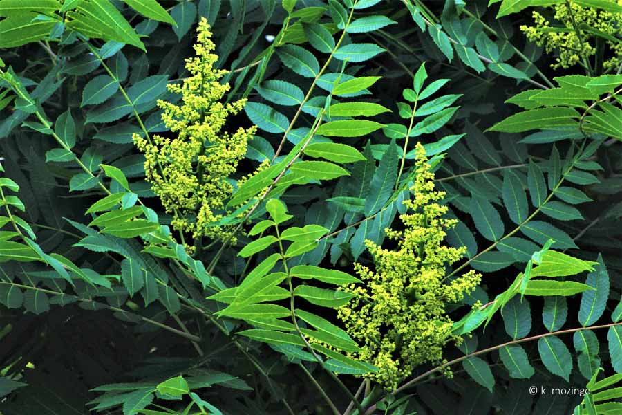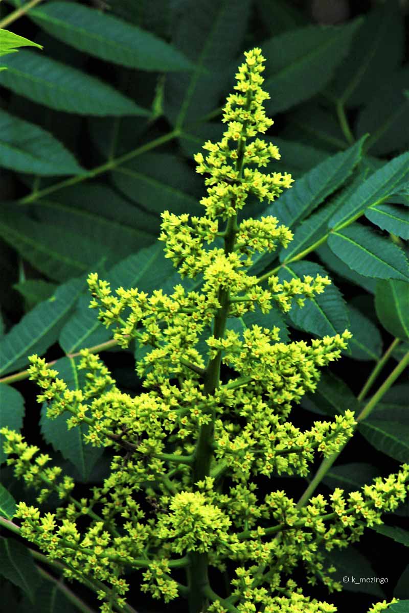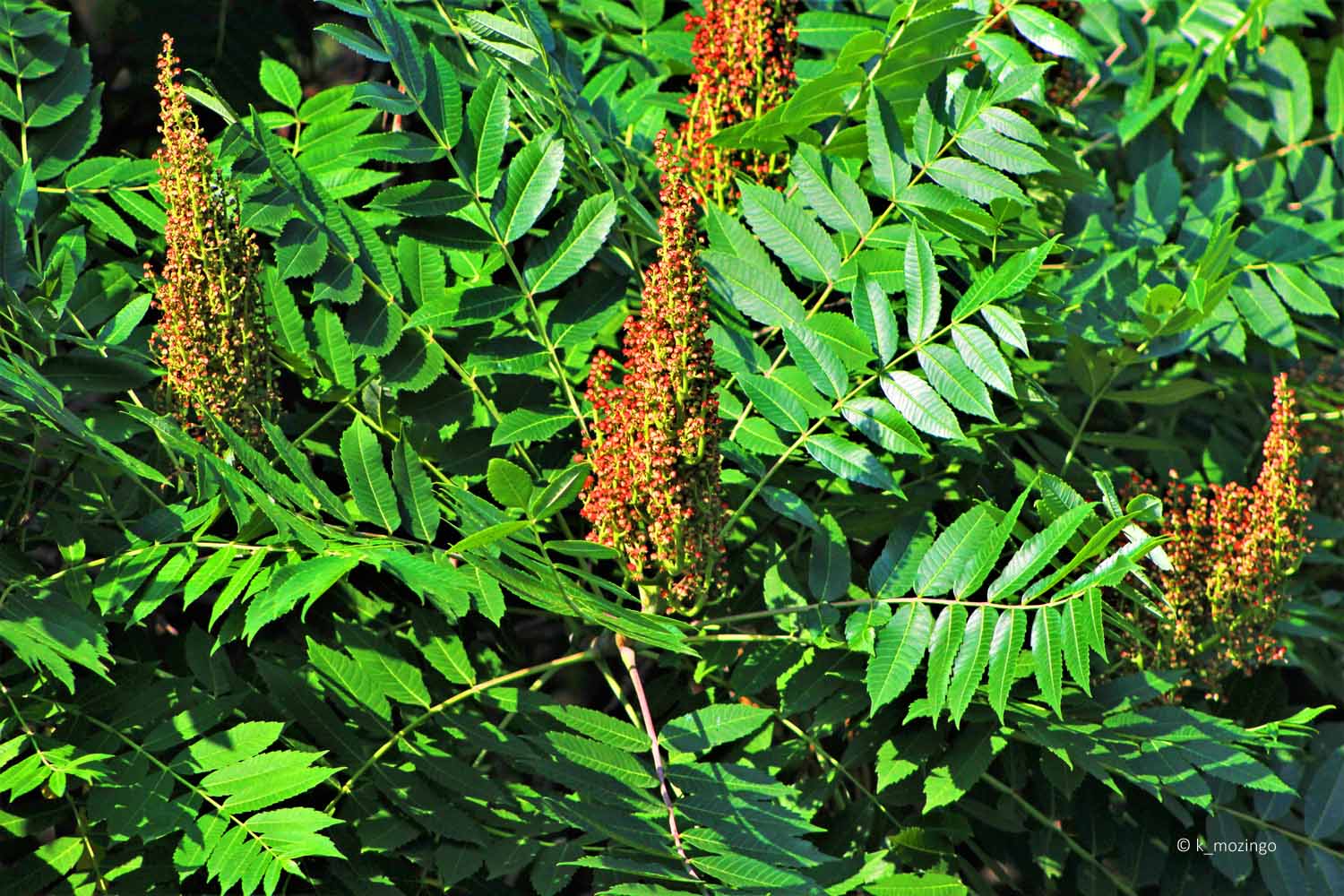 Smooth Sumac The native Smooth Sumac is common in our area. It prefers full to partial sun, moist to dry conditions, and soil containing loam or gravelly/rocky material. Habitats include prairies, edges of prairies, woodland borders, fence rows and roadsides. This shrub is usually 3-10' tall having a single trunk with several branches with alternate compound leaves, odd-pinnate with 9-31 leaflets up to 4½" long and 1" across, narrowly lance-shaped and toothed. The upper branches terminate in erect panicles of flowers that are up to 15" long and 9" across on 6" long stalks. Individual flowers are about 3/16" across with 5 yellowish green petals. The female flowers are replaced by drupes becoming mature in autumn, about 3/16" across and brilliant dark red fading to black by winter.