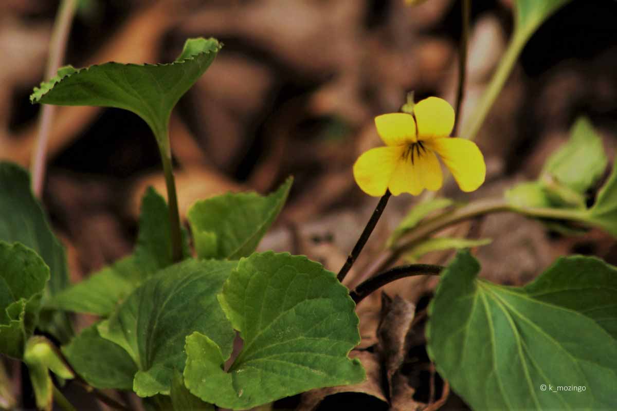 (Downy Yellow Violet) The native Smooth Yellow Violet is common in our area. It prefers partial sun or light shade, moist to average conditions and rich soil with much organic matter. Habitats include open woodlands, woodland edges, savannas, and wooded slopes along streams or ponds. This woodland spring perennial has heart-shaped leaves, about 3" wide and 2½" long, on long petioles.. The leaves have clearly visible parallel veins and coarsely toothed, uneven margins. The yellow flowers on 2-3" stalks are about ¾" across with 5 rounded petals. Thin brownish vein-like lines are prominent on the lower petal.