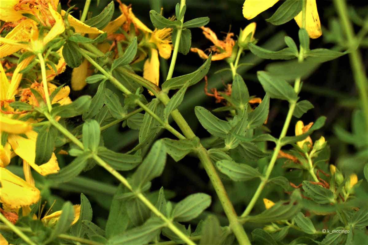Spotted St. John's Wort The native Spotted St. John's Wort is uncommon in our area. It prefers full or partial sun and moist to slightly moist rather lean soil. Habitats include black soil prairies, gravel prairies, open woodlands, savannas, woodland borders and roadsides. This perennial is up to 2½' tall, branching occasionally with opposite leaves up to 2½" long and 1" across with rounded tips. Scattered translucent dots are observable on the underside of the leaves. Its stems terminate in tight clusters of yellow flowers, each about ½" across with 5 petals and numerous yellow anthers on long styles.