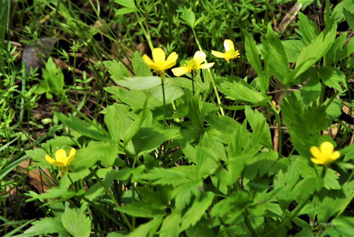 Swamp Buttercup The native Swamp Buttercup is common in our area. It prefers partial sun to light shade, wet to medium-moisture and a fertile loamy soil. Habitats include moist deciduous woodlands, soggy areas along vernal pools, swamps and partially shaded areas of seeps. This perennial is about 6" tall, although its stems can extend up to 1' long. Both basal leaves and stems with alternate leaves are produced; the latter usually sprawl across the ground. The basal and alternate leaves are 3-parted, deeply cleft and up to 3" long and across on petioles up to 3" long. Occasionally, individual flowers develop from erect unbranched stalks about 2-5" long. Each flower is about ¾" across with 5 petals, bright yellow and shiny.