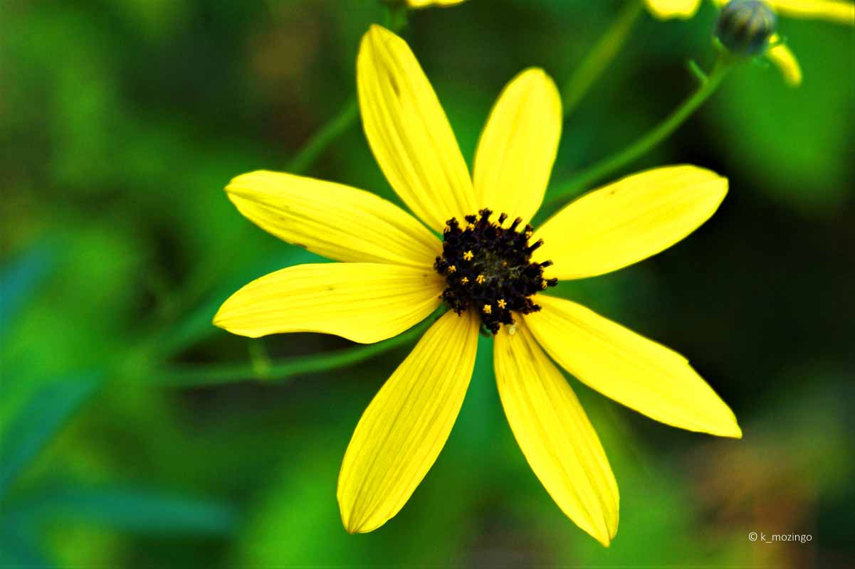 Tickseed) The native Tall Coreopsis is uncommon in our area. It prefers full to partial sun and medium-moist conditions. Habitats include black soil prairies, savannas, thickets, edges of seeps, thinly wooded bluffs and roadsides. This perennial is 3-8' tall and unbranched, except for flowering stems along the upper one-half of its length. Its opposite leaves are compound odd-pinnate with 3 or 5 leaflets up to 5" long and ¾" across, linear-elliptic to elliptic in shape and toothless on petioles up to 1½" long. The upper stems terminate in solitary to cyme-like clusters of flowers on stalks up to 10" long. Each flower is 1½–2" across with 8 widely spreading yellow ray florets surrounding a dense head of numerous dark purple to reddish-brown disk florets.