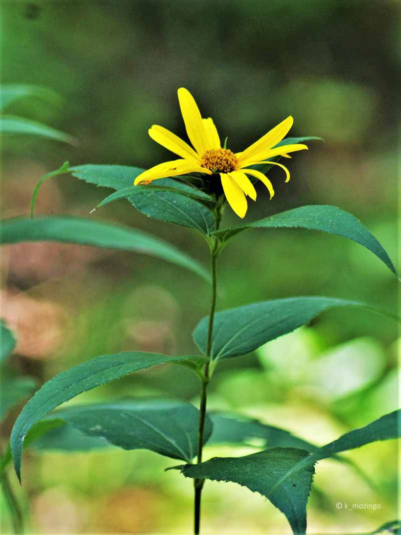 (Ten-Petal Sunflower) The native Thinleaf Sunflower is uncommon in our area. It prefers partial sun or dappled sunlight and moist to slightly-moist rich loamy soil. Habitats include open woodlands, woodland borders, meadows and partially shaded areas along streams. This perenniall is 3-5' tall with erect stems branching occasionally. The lower and middle leaves are opposite, while the upper leaves are alternate. The leaf blades are up to 7" long and 3" across and lance-shaped with long slender tips and sharply toothed, on petioles ½–1½" long. The upper stems terminate in yellow compound flowerheads, 2–3½" across with 8-12 yellow ray florets surrounding numerous yellow tubular disk florets in a central disk.