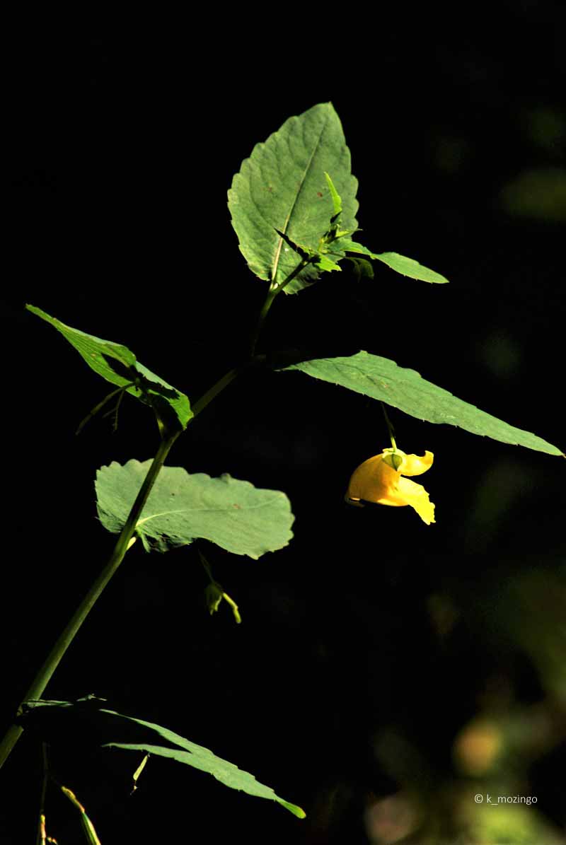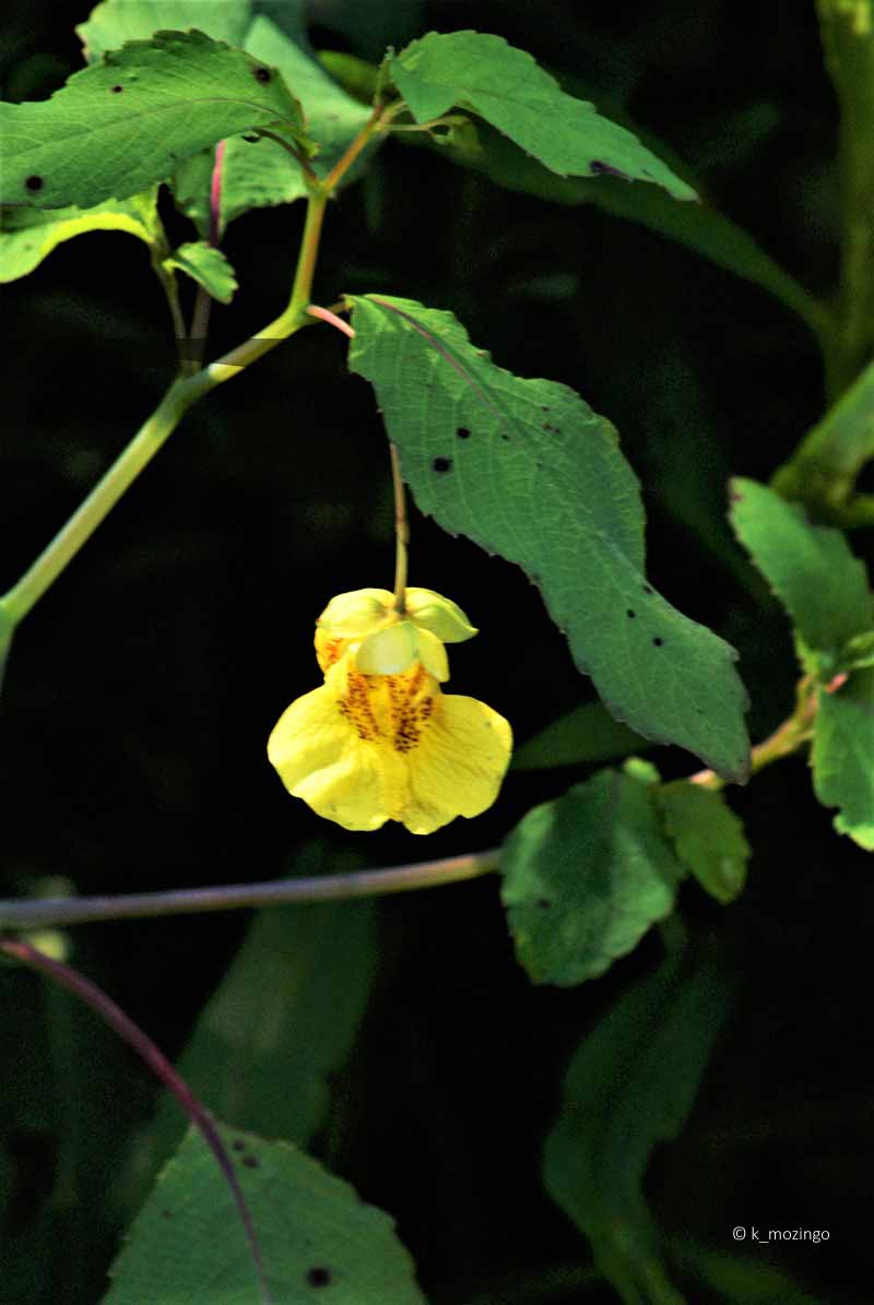 (Pale Touch-Me-Not) The native Yellow Jewelweed is uncommon in our area. It prefers partial sun, wet to moist conditions, and soil that is loamy or mucky. Habitats include muddy borders along ponds and streams in wooded areas, swamps, fens, and openings in moist deciduous woodlands. This is a charming summer annual with smooth, almost translucent stems, 2-4' tall, with alternate, pale green, oval leaves up to 4" long and 2" across and coarsely toothed on slender petioles up to 2" long. From the axils of the upper leaves, there occurs short raceme of 1-3 yellow flowers. Each flower is about 1" long in a conical shape with upper and lower lip petals. The upper lip curves upward, while the 2 lower petals form landing pads for visiting insects. Each flower dangles from a slender pedicel about ¾" long.