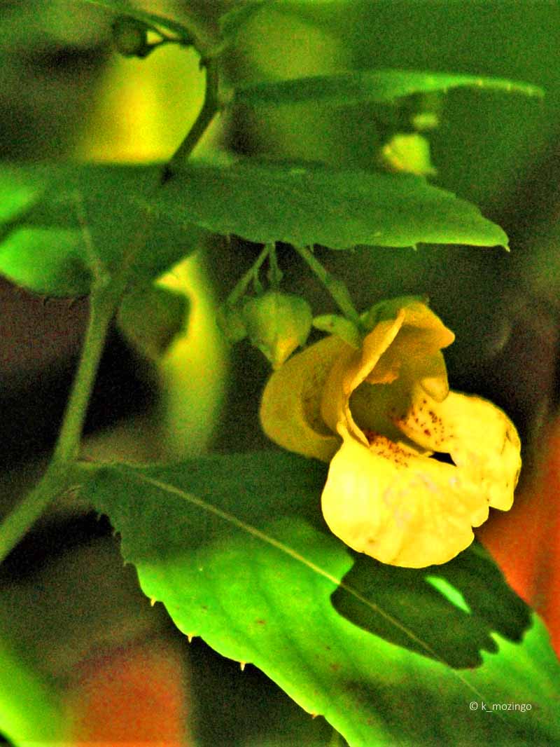 Yellow Jewelweed at Harris Forest Preserve pond July 12, 2015 It is very intriguing how the flowers are suspended horizontally on arching, slender petioles. The conical flower's posterior tapers to a skinny nectar spur that hooks around forward to a position underneath the rest of the flower. Jewelweed is a favorite of the Ruby-Throated Hummingbird as its long tongue is uniquely able to get back into that nectar spur.