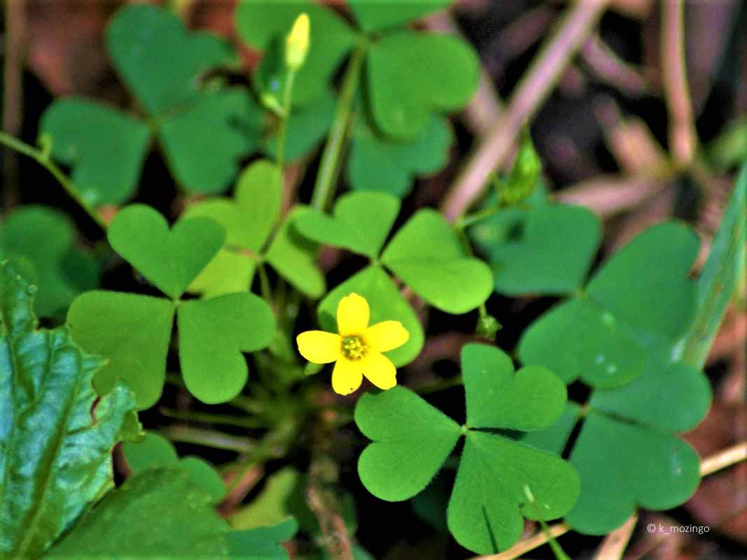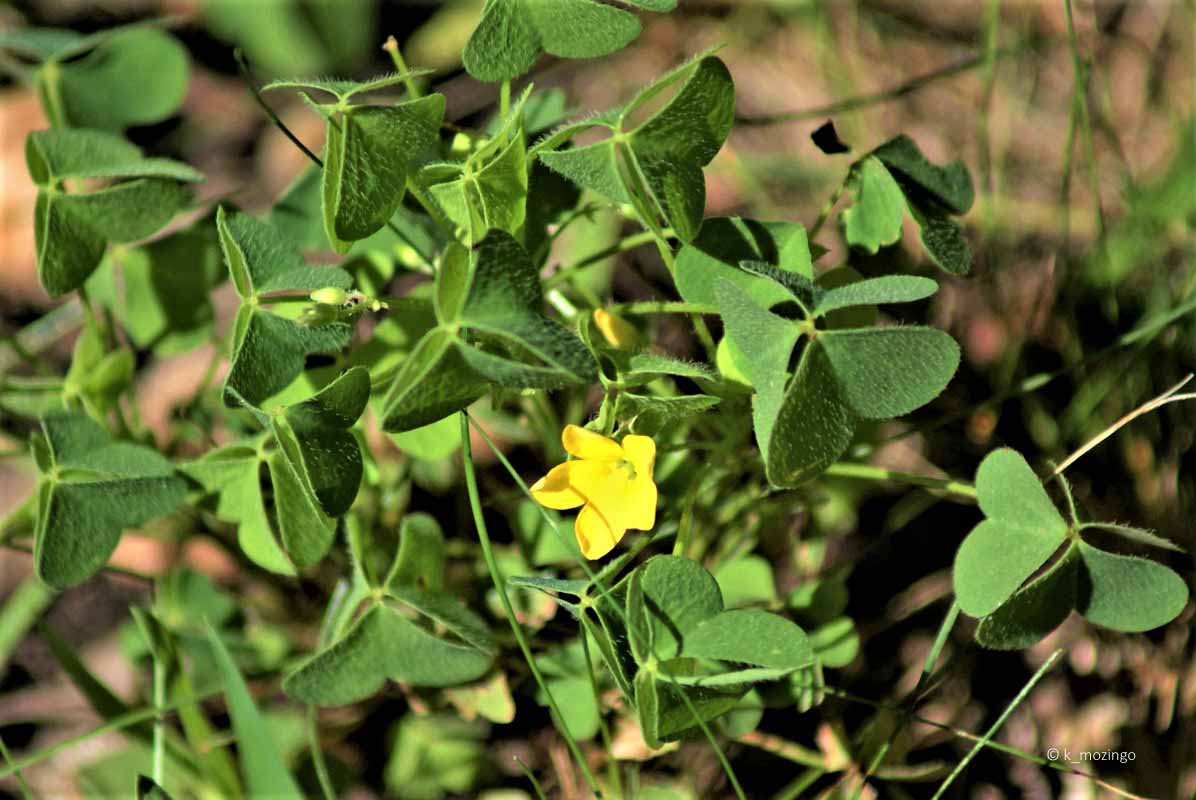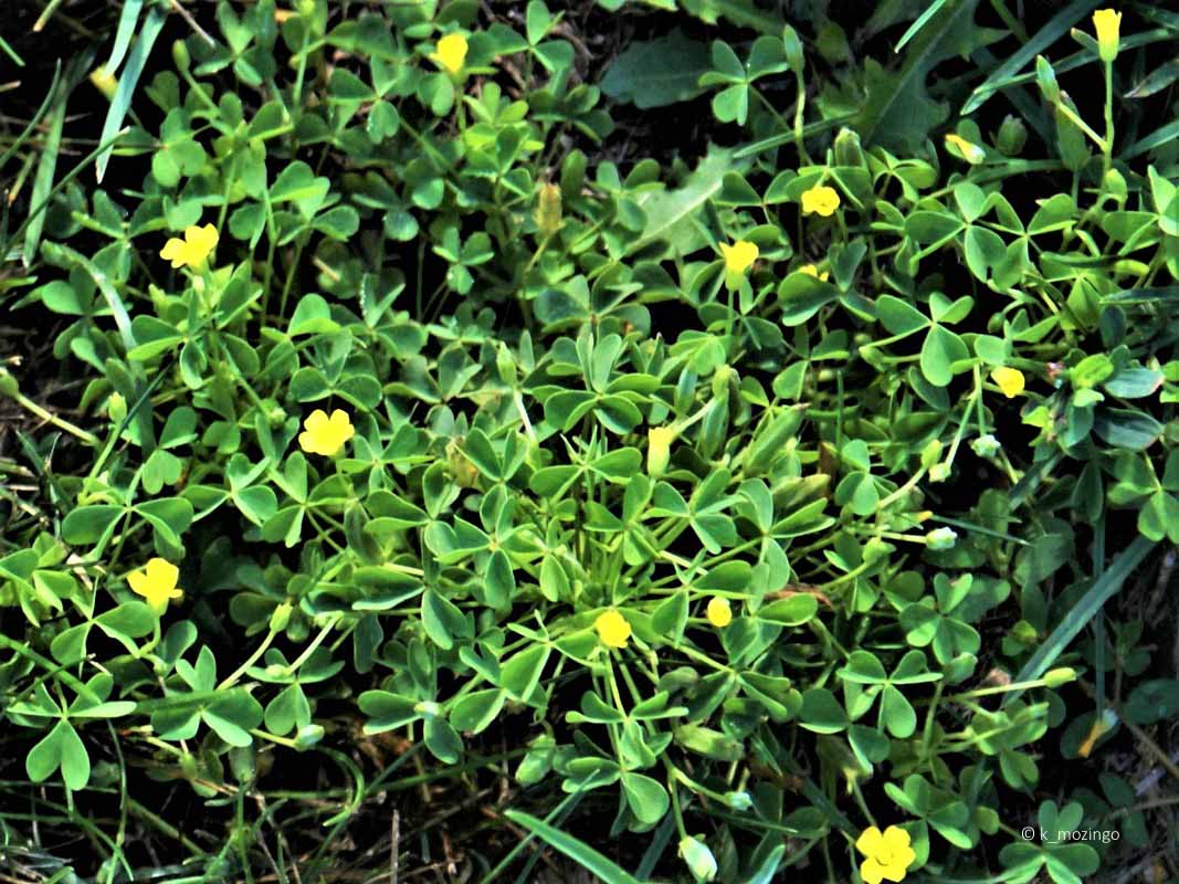 (Sour Grass) The native Yellow Wood Sorrel is common in our area. It prefers partial to full sun and slightly moist to dry loamy soil. Habitats include open woodlands, grassy meadows, edges of driveways, parking lots and roadsides. This perenniall is typically 3-8" tall, branching abundantly, with stems covered with short hairs and alternate trifoliate leaves with a 3-leaf clover appearance on petioles up to 2½" long. In the absence of sunlight, the pale green leaflets (¼-½" across) droop downward and fold along their central veins. Small umbel of 2-6 flowers are produced from the axils of leaves. These flowers are about 1/4-3/8" across with 5 yellow petals.